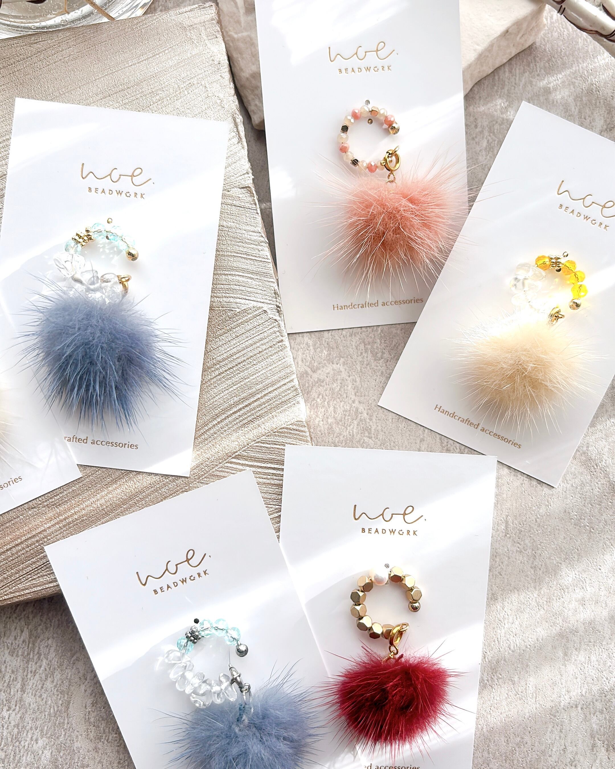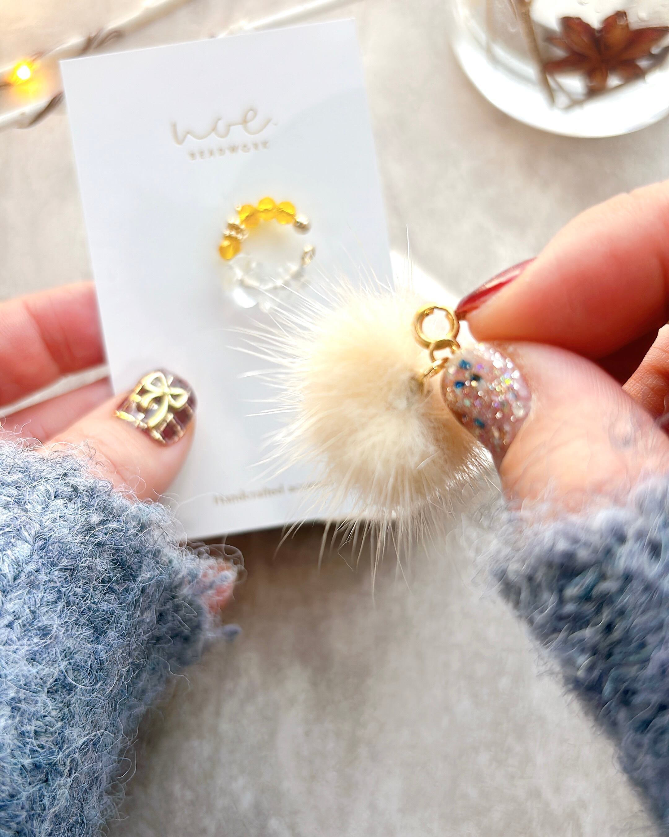 【 2way仕様 】ミンクファーのぽんぽんつきイヤーカフ / イエロー×アイボリーG