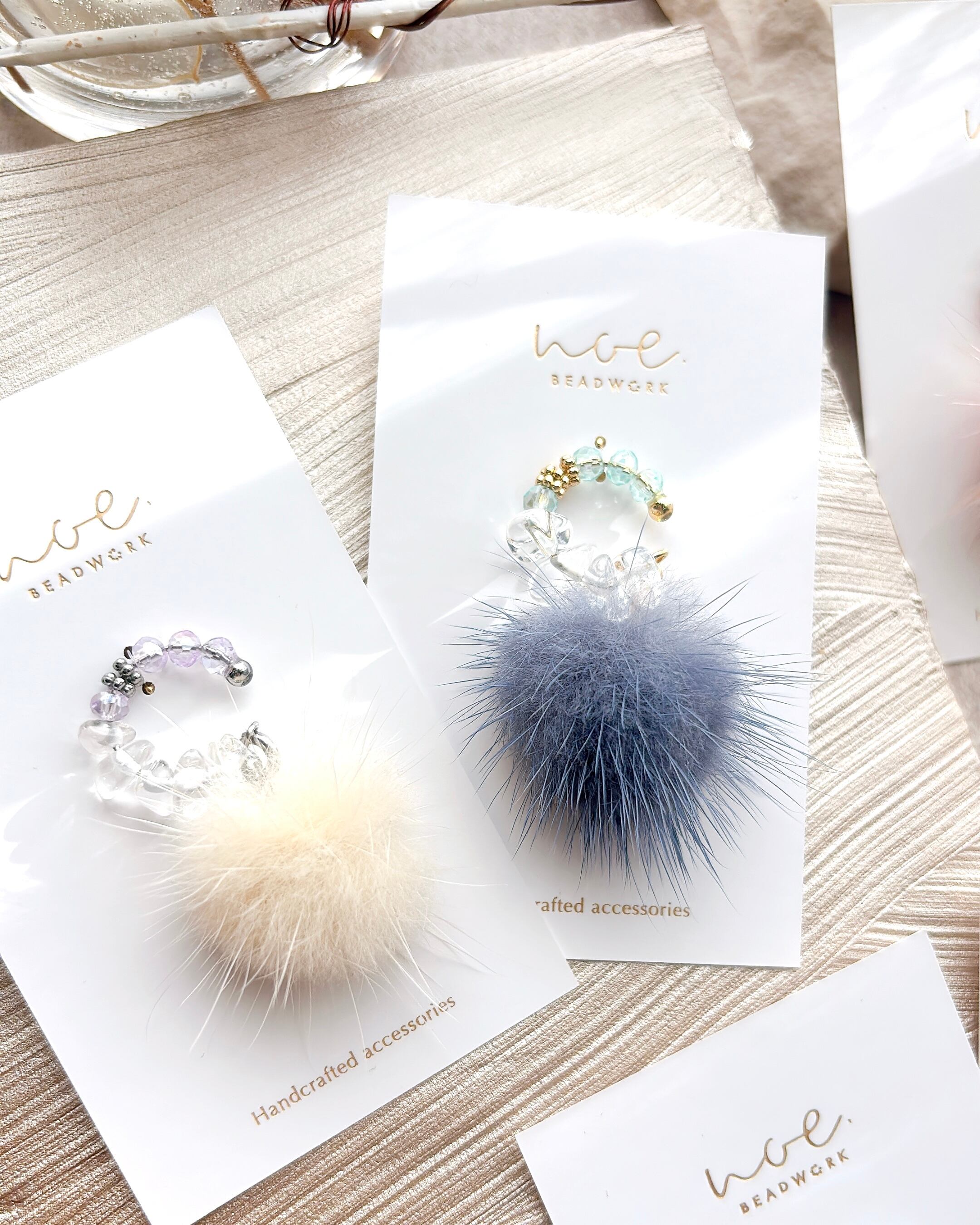 【 2way仕様 】ミンクファーのぽんぽんつきイヤーカフ / ライトパープル×アイボリーS